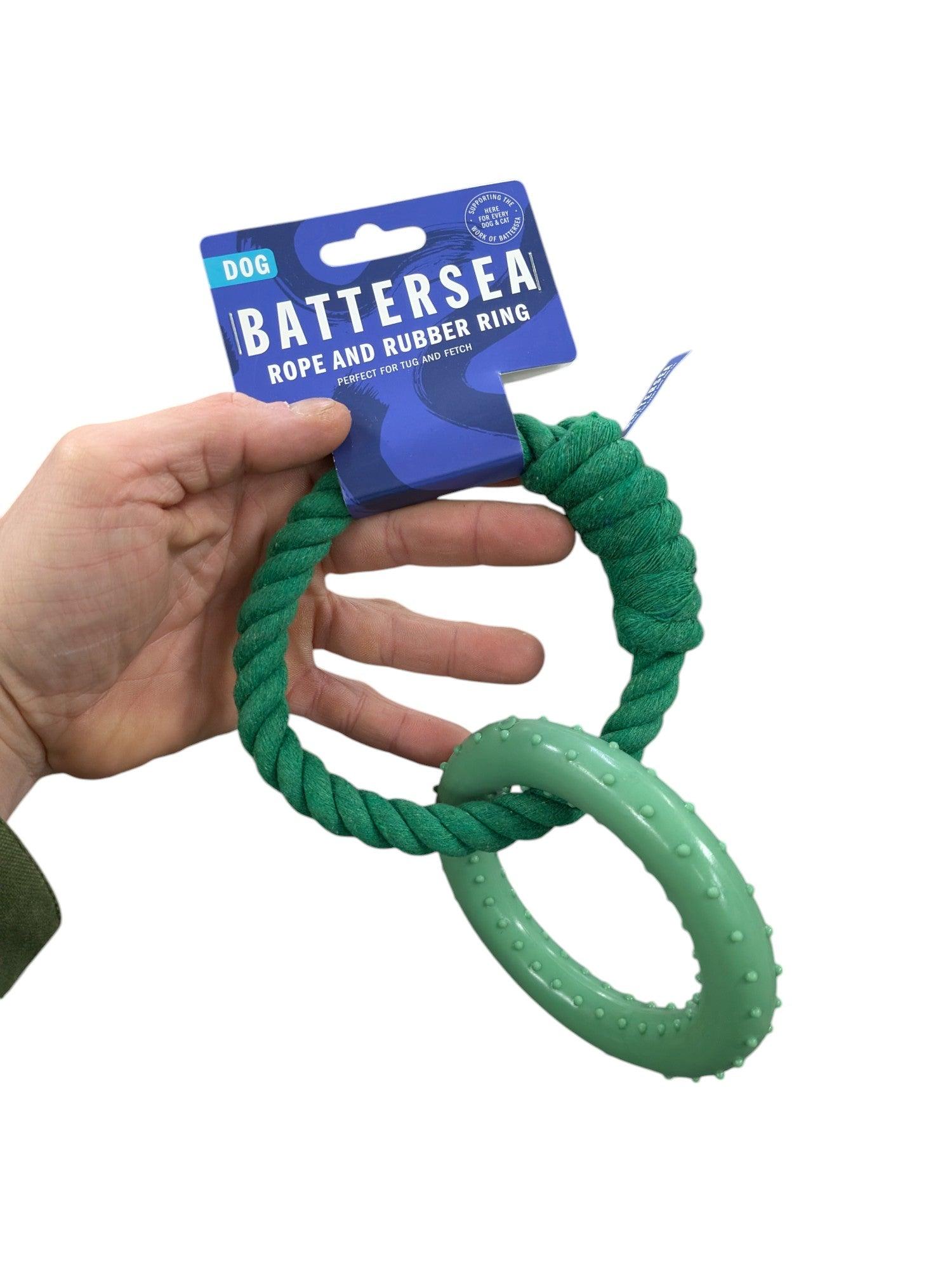 De Battersea Ring Rubber / Touw Groen is ideaal voor honden die houden van interactieve spelletjes en lichte kauwactiviteiten. Geschikt voor kleine tot middelgrote honden.