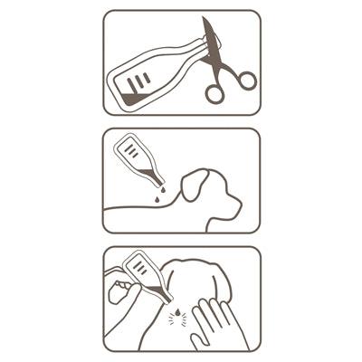 Open 1 pipet, zet hem eventueel neer, maak met twee handen de vacht op de nek vrij en breng de volledige inhoud direct op de huid aan. Niet wrijven. Niet wassen tot het product droog is.