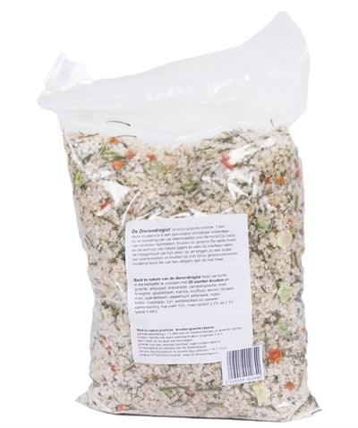 Back To Nature Premium Kruiden-Groente-Rijstmix is een hoogwaardige aanvullende maaltijdmix, speciaal ontwikkeld om de natuurlijke voedingsbehoeften van jouw hond te ondersteunen. Deze mix is gebaseerd op ontsloten rijstvlokken, kruiden en groenten, en is een ideale toevoeging aan de vleesmaaltijden van jouw hond. Het product is geïnspireerd op het dieet van de wilde hond en wolf, die via de maaginhoud van hun prooi plantenresten en kruiden binnenkrijgen. Met 20 zorgvuldig geselecteerde kruiden en groenten biedt deze mix een natuurlijke, voedzame aanvulling op de dagelijkse voeding.