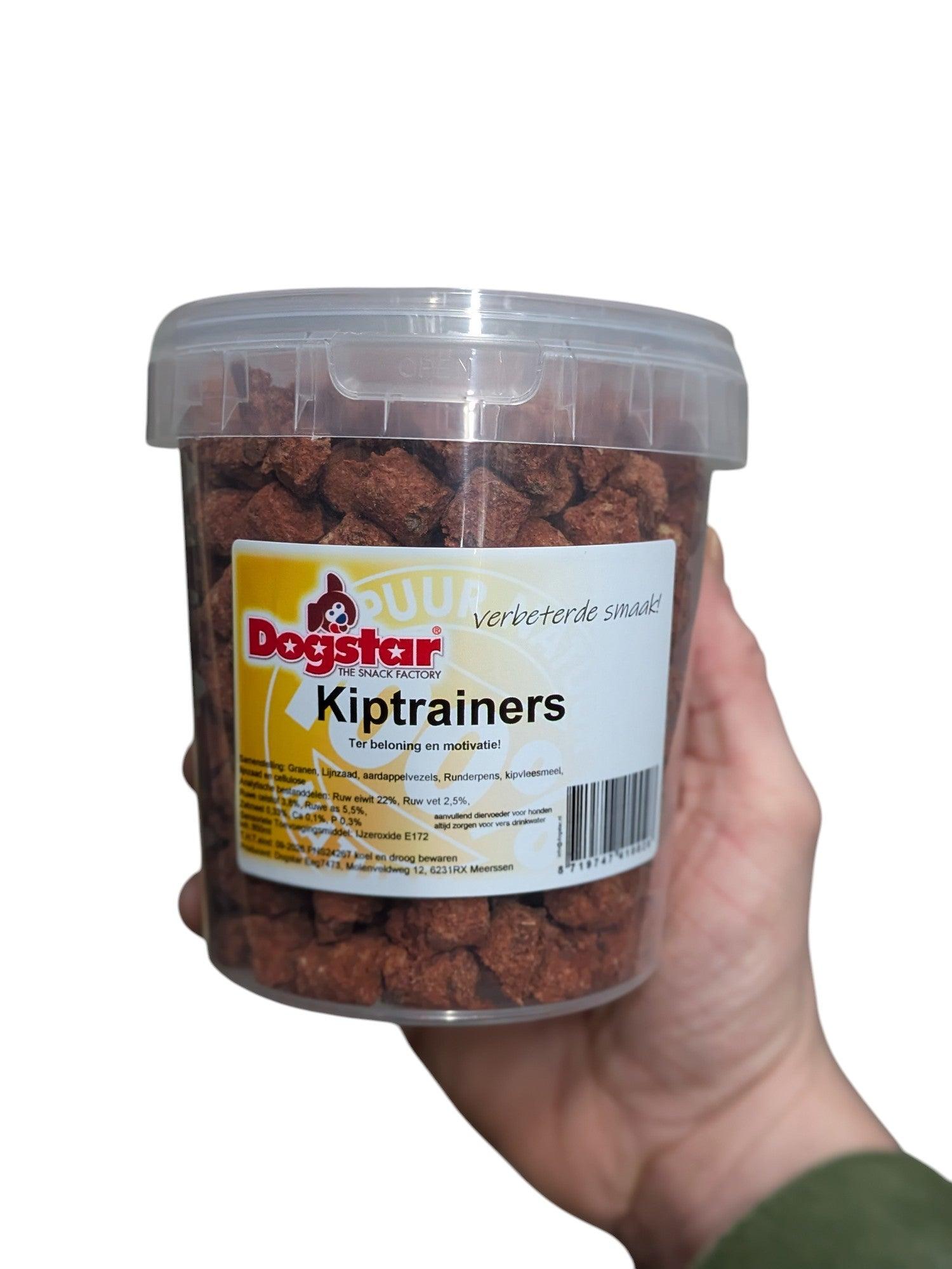 De Dogstar Kiptrainers 850 ml zijn hondensnacks, ideaal om in te zetten tijdens de hondentraining. Beloningen zijn een enorm belangrijk onderdeel van de training. De Kiptrainers van Dogstar zijn de ideale beloning door het kleine formaat en de lekkere smaak. Je kunt ze natuurlijk ook als lekkernij tussendoor geven. De trainers zitten in een handig potje, waardoor ze langer vers blijven.