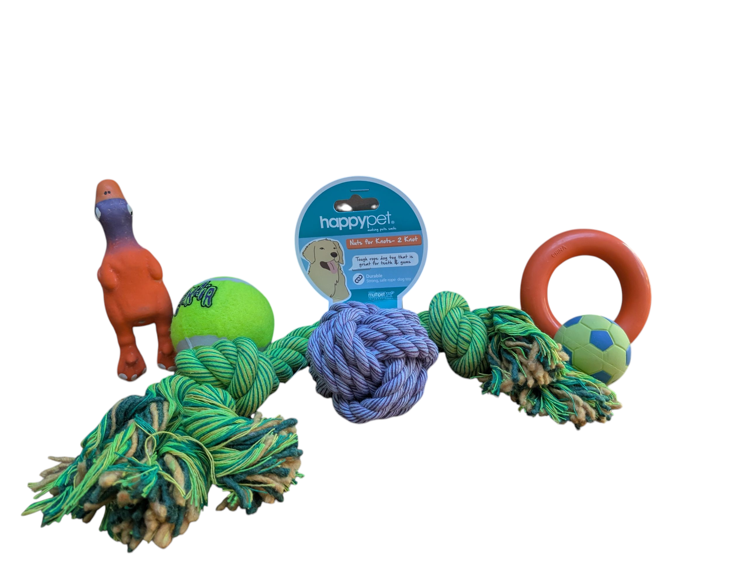 Dit speelgoedpakket is geschikt voor kleine honden en puppy’s. Voor middelgrote of grotere honden kunnen sommige speeltjes te klein zijn.