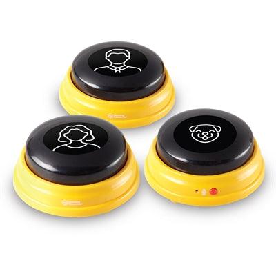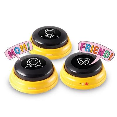 Deze set bevat drie inspreekbare buttons, waarmee je belangrijke namen of woorden kunt vastleggen, zoals de naam van een gezinslid, een favoriete speeltijd of een activiteit. Dankzij de bijgeleverde icon-stickers kun je de knoppen duidelijk labelen. Daarnaast ontvang je een handleiding van de oprichtster, met tips over hoe je de knoppen effectief kunt introduceren en trainen.