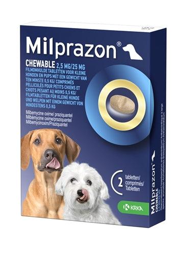 KRKA Milprazon Ontwormingstabletten van 12,5 mg / 125 mg per 2 tabletten zijn smakelijke kauwtabletten met milbemycine oxime en praziquantel voor de kleine hond of pup, met een gewicht van ten minste 5 kg, tegen alle veel voorkomende wormen. Zo bestrijd je met deze tabletten spoelwormen, haakwormen, zweepwormen, lintwormen en ook de vossenlintworm, hartworm, longworm en oogworm bij de hond. De tablet is deelbaar en heeft een leversmaak voor een hoge vrijwillige opname. Veilig te gebruiken bij pups vanaf twee weken en/of een gewicht van 5 kg en eveneens bij dracht en lactatie.
