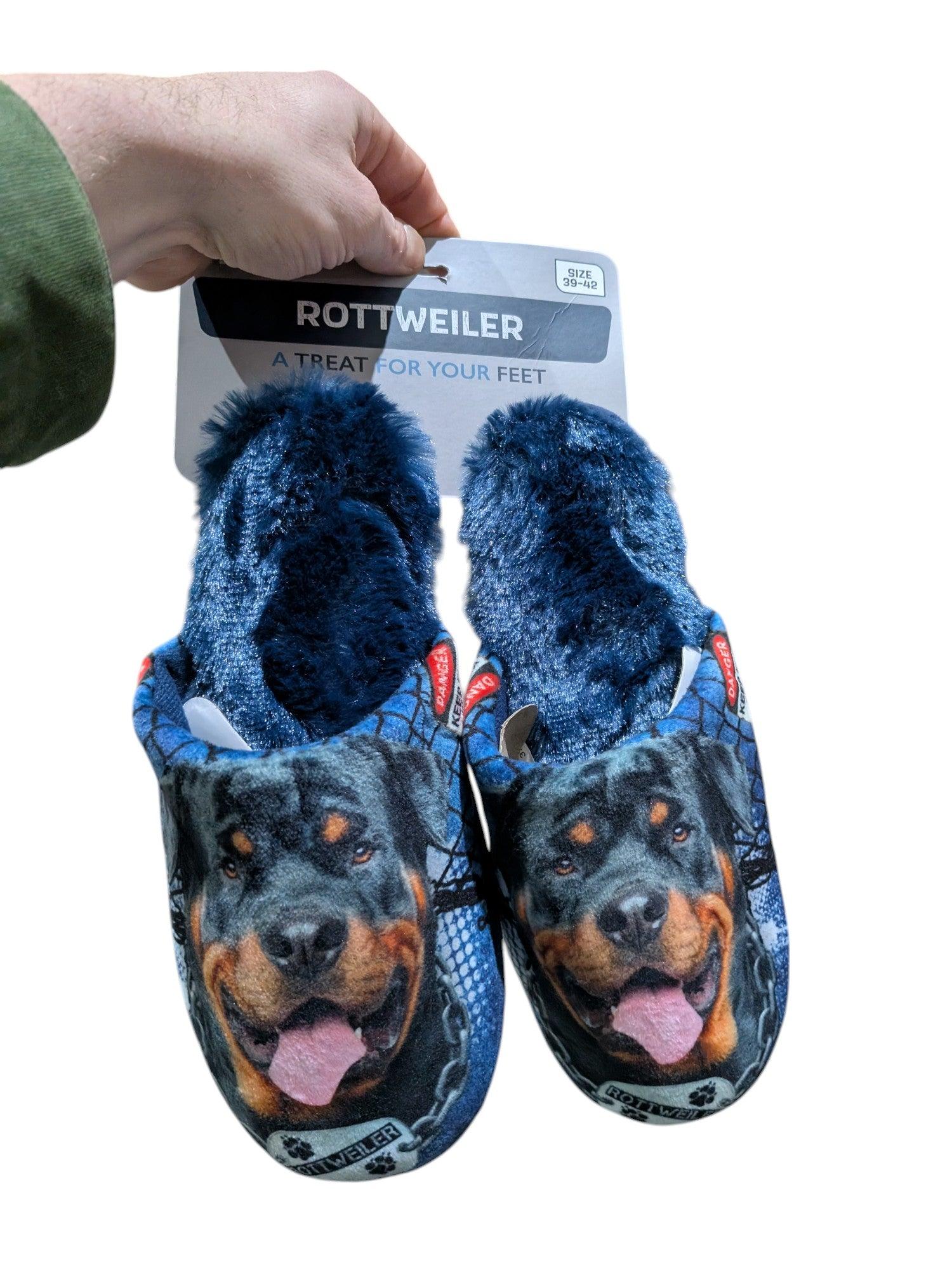 De Pantoffel Rottweiler Donkerblauw 39-42 zijn pantoffels met dierenprint en bieden ultiem warmte en comfort, perfect voor gezellige momenten thuis. Gemaakt van zacht materiaal en uitgerust met een dikke zool, zorgen ze voor een heerlijke, warme ervaring en een luxe gevoel bij elke stap. De charmante dierenprint voegt een speelse touch toe aan je ontspanningsmomenten.