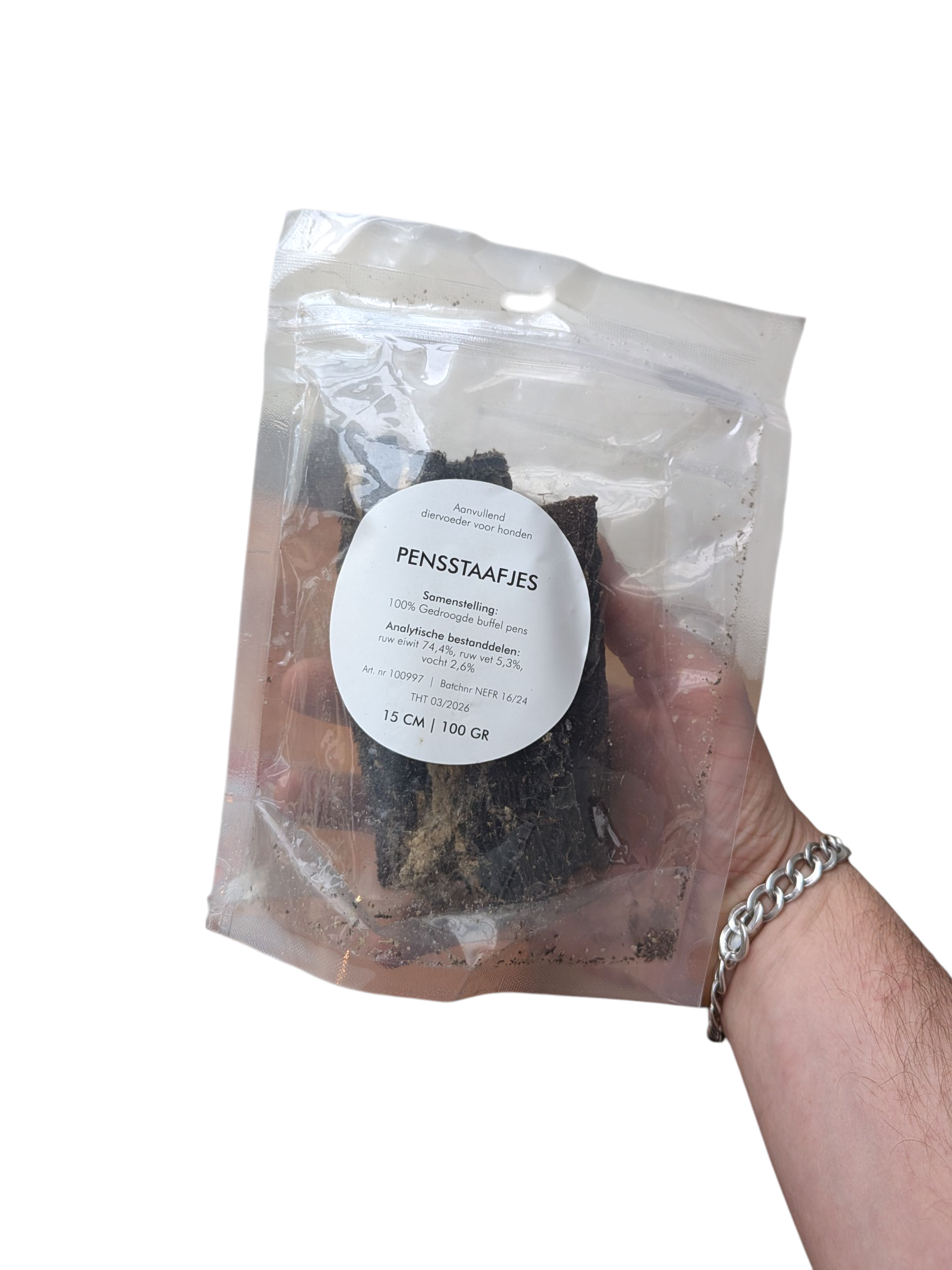 Petsnack Pensstaaf 15 cm 100st hondensnack is een kauwsnack voor honden van gedroogde runderpens zonder conserveringsmiddelen. De stukjes pens zijn gedroogd en gemaakt zonder conserveringsmiddelen, 100% natuurlijk dus! Pens kun je geven als lekkere snack of als beloning. Het geven van pens kan het eten van poep op straat voorkomen bij pups.