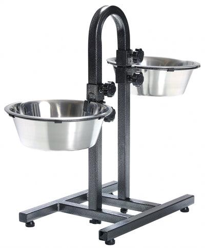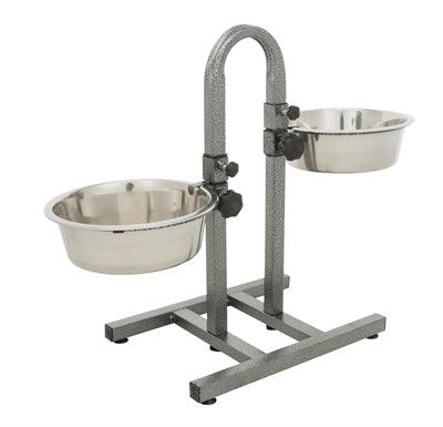 Dit is een ideale voerstandaard voor mensen die graag zelf de hoogte van de voer- en drinkbakken van hun dieren instellen. Deze H-vormige standaard is vernist en heeft aan beide zeiden een voer- en drinkbak bevestigd. Je kunt de hoogte van de bakken bepalen door de standaard te verstellen, door de handige draaiknoppen boven en onder in te stellen zoals jij ze wilt hebben. Om het nog makkelijker te maken, kun je de bakken los van elkaar verschuiven, zodat de hoogte verschillend kan zijn. Door deze hoogte goed op jouw dier af te stemmen, help je jouw hond zijn eten beter te verteren.