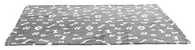 Dit hondendeken heeft een grijze kleur met een witte print van botjes en pootafdrukken. Het is perfect te gebruiken in een hondenmand, op de bank of als bescherming in de auto.
