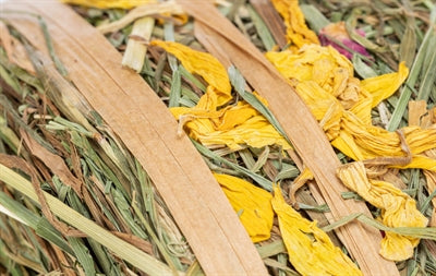 • Natuurlijk hooi met bloesems, omwikkeld met henneptouw