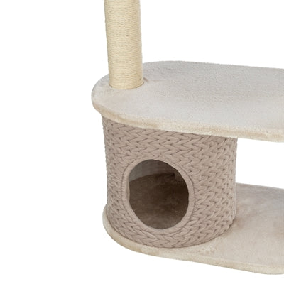 De Trixie Krabpaal Alessia Lichtgrijs/Zand 65X38X114 cm is vervaardigd uit hoogwaardige materialen zoals jute, pluche en velours. Het gevoerde ligplateau biedt extra comfort en wordt geleverd met een afneembare relax-mand. De schuilplaats, gemaakt van zacht velours, biedt je kat een knusse plek om te rusten. Daarnaast is de krabpaal uitgerust met een hangmat, perfect voor ontspanning. Ideaal voor katten die graag krabben, spelen en ontspannen in stijl.