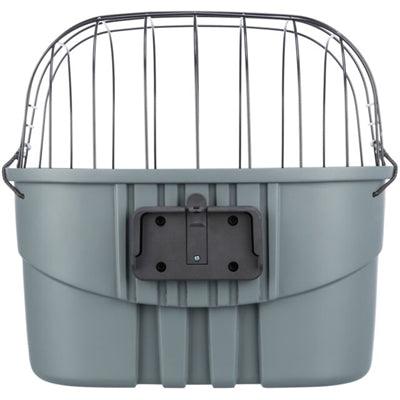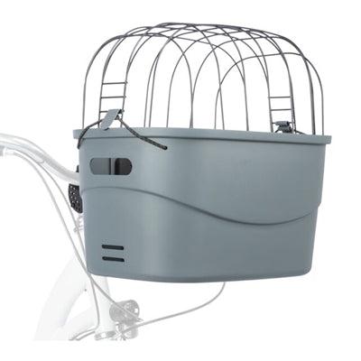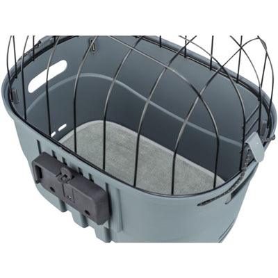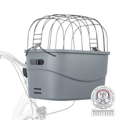 De fietsmand bestaat uit een slijtvaste kunststof bak met een stevige bovenkap van metaalgaas. Dit houdt jouw hond veilig op zijn plek, terwijl hij vrij kan kijken en genieten van de buitenlucht. Binnenin ligt een slipvaste mat die voorkomt dat je hond tijdens het fietsen wegglijdt. Daarnaast is er een bevestigingsmogelijkheid aanwezig voor een korthouder of hondenriem, zodat je jouw hond veilig vast kunt zetten.